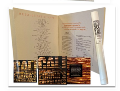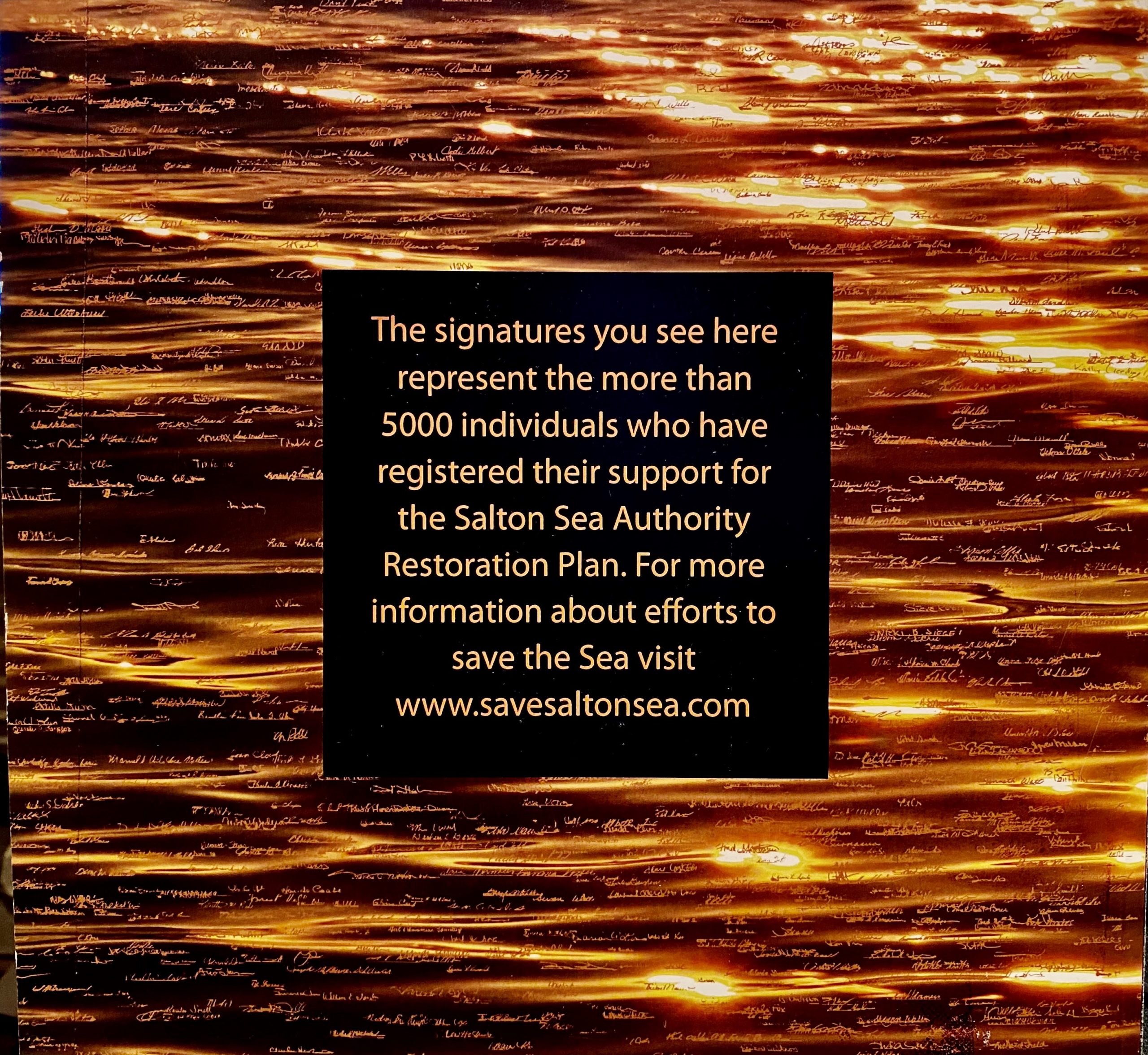 The signatures and physical expressions of support were published in a book and that was delivered with the message “The Future of the Salton Sea is In Your Hands” to every elected member of state legislature. This hard to miss delivery came with 5,000 more reasons to Save the Sea in the form of a poster with the signatures of support that had been gathered during outreach.